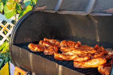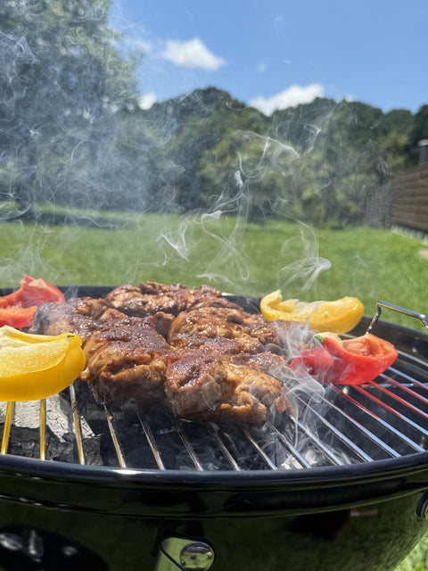 ソースが炭に落ち、立ち上がる煙が香ばしく鶏肉をスモークしていく。